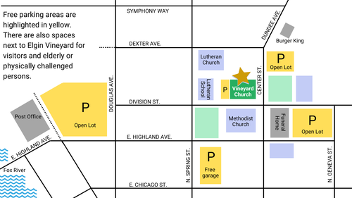 We have a small parking lot set aside for visitors and the elderly on the west side of our building. But this lot does fill up. Street parking is often available, but there are also several free opportunities offered by the City of Elgin — best bets are the lot across Center Street or the city garage across Highland Avenue.